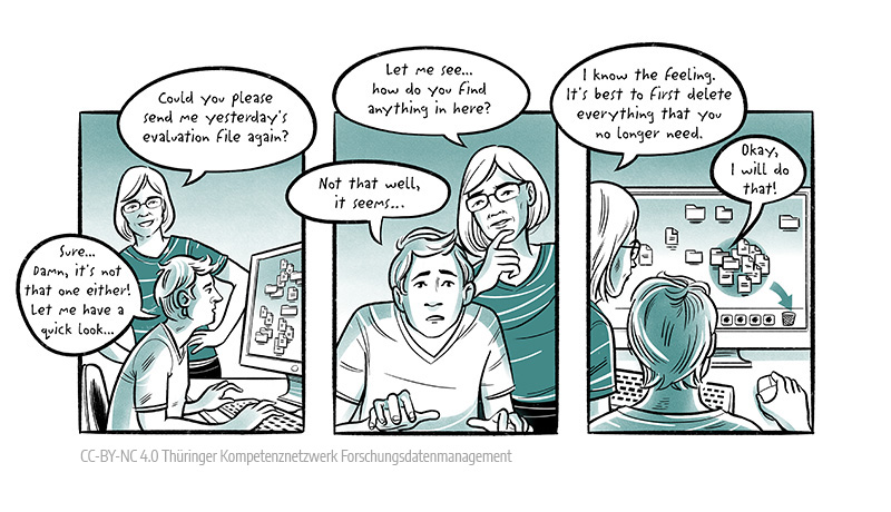 First, a folder structure should be created that corresponds to the work areas within a project. In the sciences, these are usually areas such as finances, presentations, publications, studies, source code or literature. Since sorting the folders by initial letters is often not useful, because certain areas may be more important than others, the names of the folders can be started with a number to let the operating system sort them automatically. This can be e.g. "01_studies" and "03_publications". As a rule of thumb, all folders should be easy to grasp on one level (i.e. about 7 different folders) and no more than 3 folder levels should be created in-depth so that one does not have to click unnecessarily deep into the folder structure to get to a certain file.
