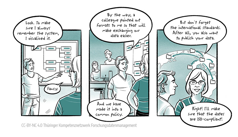 An SOP (Standard Operation Procedure) can be used to document the standard procedure, especially for workgroups or cross-workgroup consortia that work in common directories and/or frequently share files. It contains a binding textual description of the standardized procedure and is usually divided into objectives, scope of application, description of the workflow and responsibilities. The SOP can specify the organizational structure and designation of folders and files, but also describe how to handle the established folder and file system: