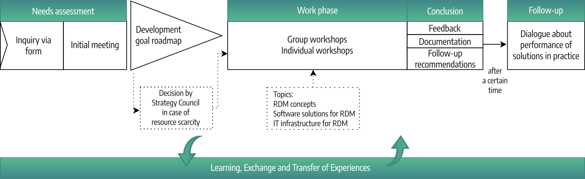 In dialog with the requesting research group, the Data Stewards analyze the existing data management routines and determine the needs and requirements of the team. Together we identify development goals and agree upon a roadmap.