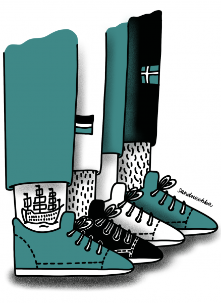 Als das Schiff in den Fluten versinkt, betrachten die Zimmermänner sorgenvoll ihre Füße.